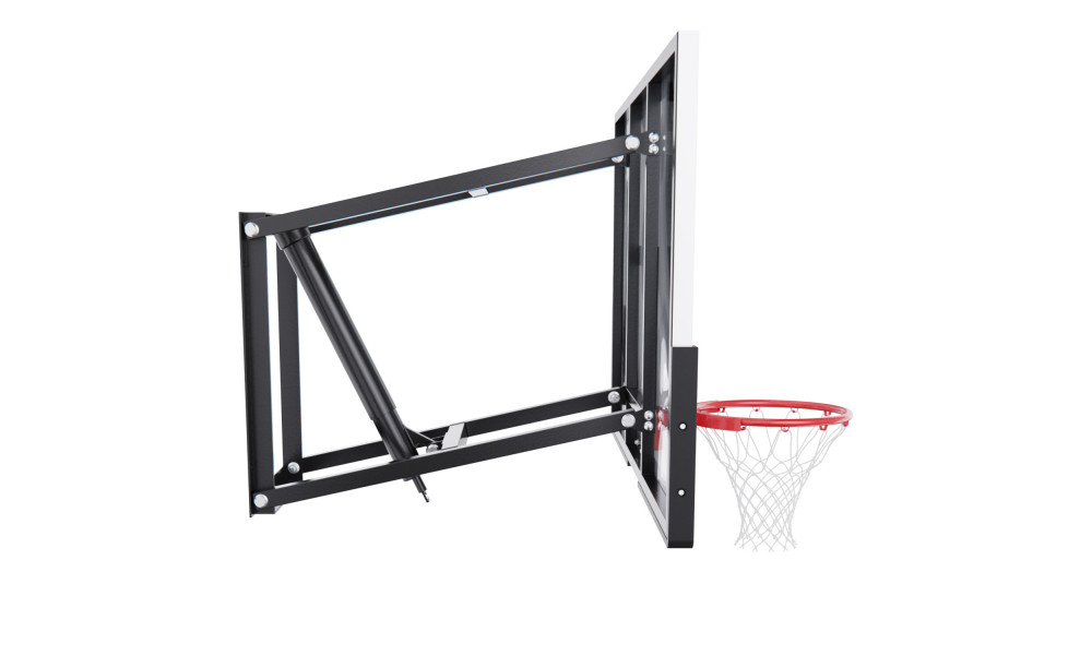 Щит изготовлен из прочного закалённого стекла толщиной 6 мм — материала, обеспечивающего отличный отскок мяча и устойчивость к ударам. Его размеры — 136 х 80 см, что делает его максимально приближенным к профессиональному оборудованию. Регулируемый вынос щита (51–55,5 см) повышает безопасность и удобство во время игры.